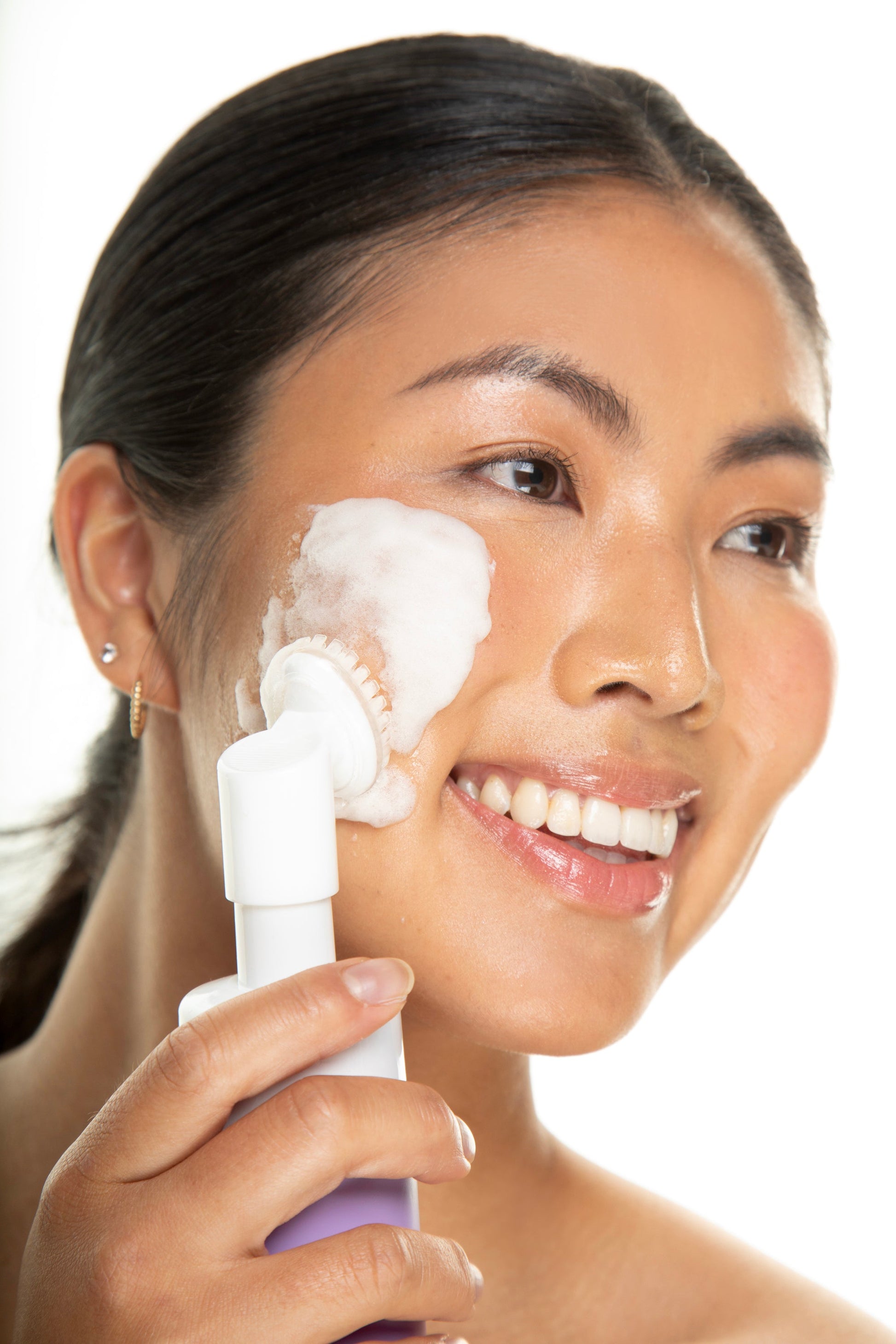 -Pump our gel foam, rub silicone brush all over face and neck in circular motion for 2 minutes.
