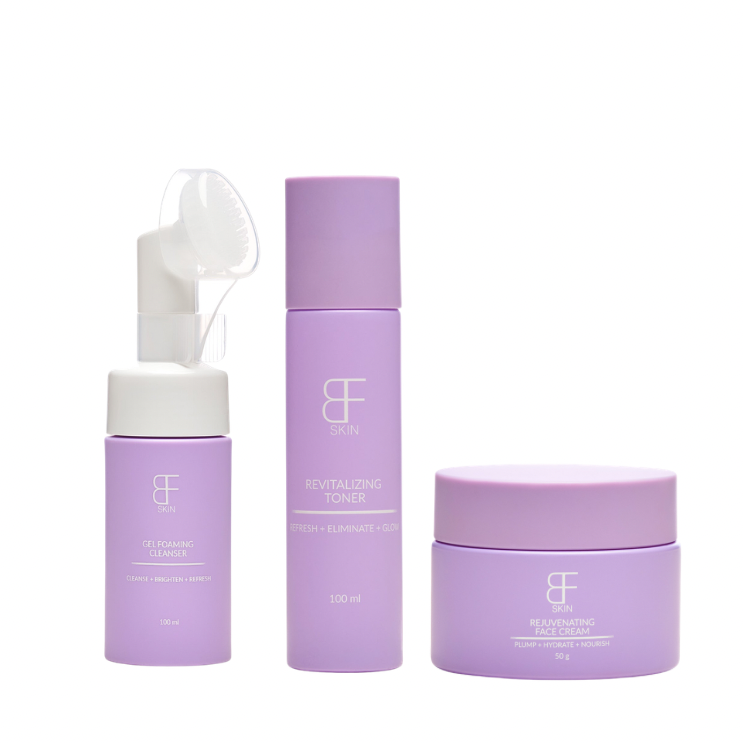 Featuring our Gel Foaming Cleanser designed for an easy, deep cleanse to purify skin, eliminate sebum and eradicate impurities. Revitalizing Toner to effortlessly remove dirt and unclog pores for a smooth finish, and Rejuvenating Face Cream to deliver long-lasting hydration while tightening skin!
